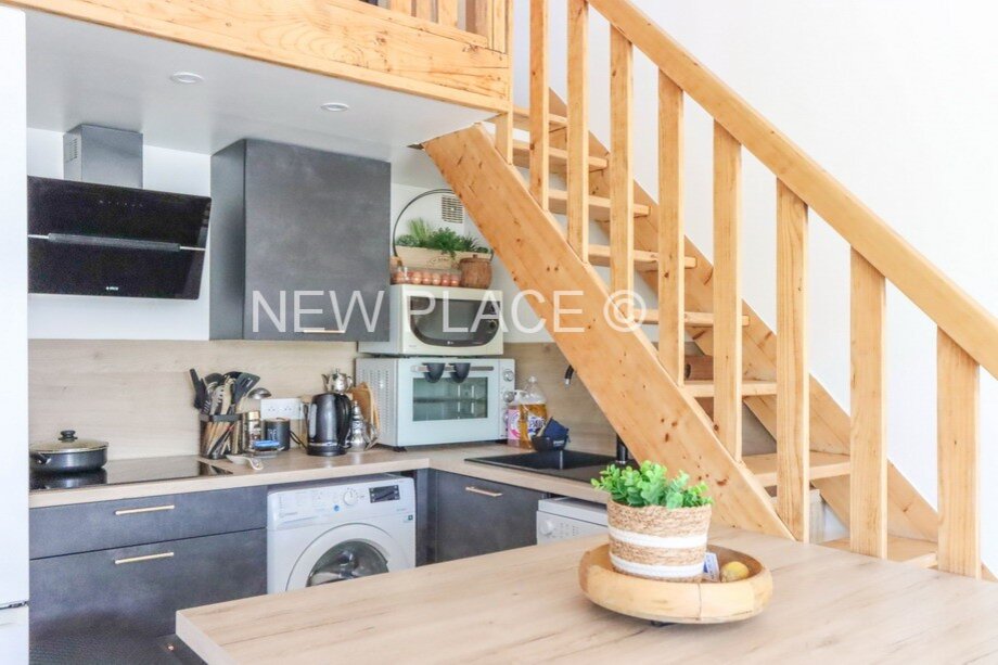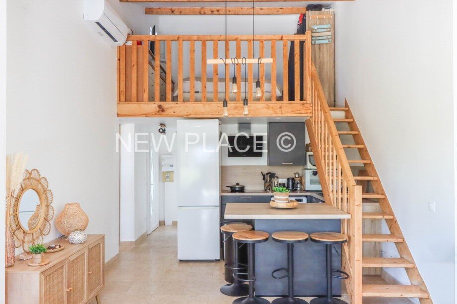 Es besteht aus: Eingang, Wohnzimmer mit großen Schiebefenstern, offene Küche, Duschraum mit WC. Ein Schlafzimmer im Erdgeschoss, und ein 2. Schlafzimmer auf ein Mezzanin.